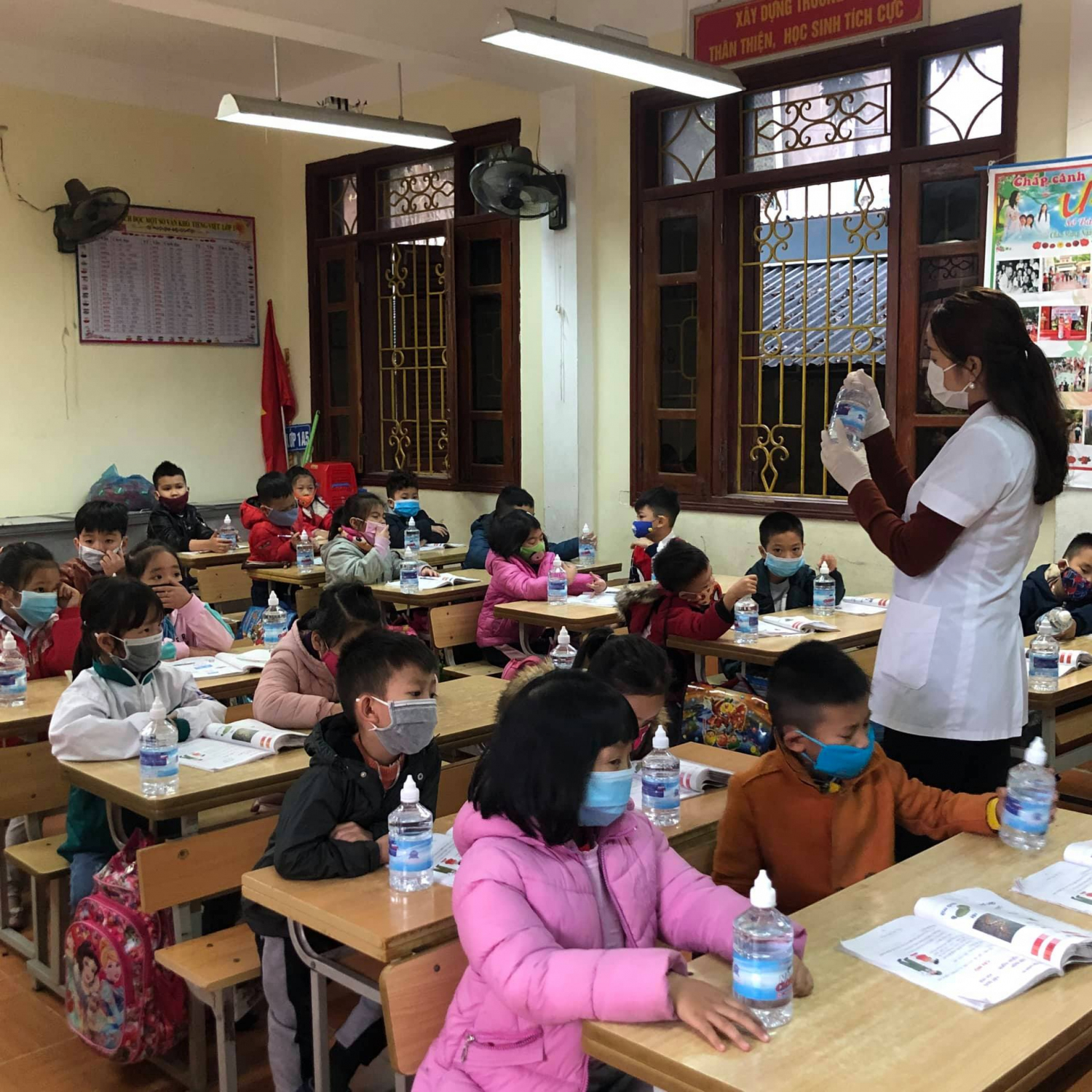 100 % Học sinh đến trường đeo khẩu trang và đem nước uống cá nhân, không uống nước chung cốc.