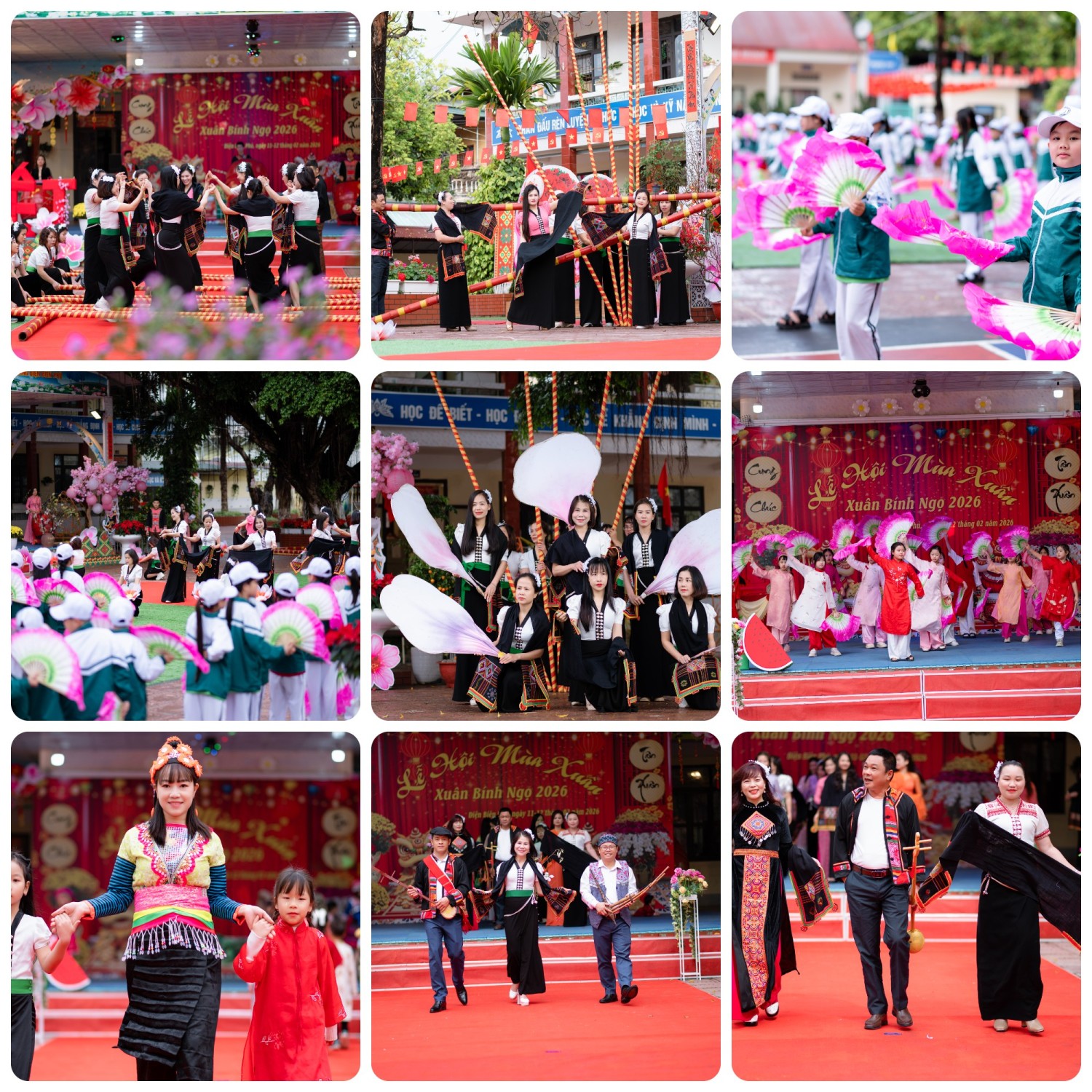 Không gian lễ hội thực sự bùng nổ với màn Trống hội mang chủ đề “Âm sắc mùa xuân”. Tiết mục được đầu tư bài bản dưới sự chỉ đạo nội dung và nghệ thuật của cô giáo Đinh Thị Thanh Nhàn – Bí thư Chi bộ, Hiệu trưởng nhà trường và biên đạo bởi cô giáo Đặng Thị Hương Giang. Ngay sau tiếng trống hội giục giã, hàng trăm học sinh cùng hòa mình vào màn Đồng diễn múa Xòe tập thể. Vòng xòe rộng mở không chỉ tái hiện nét đẹp đoàn kết của đồng bào dân tộc vùng cao mà còn thắp lên niềm tự hào về di sản Tây Bắc trong lòng các em.